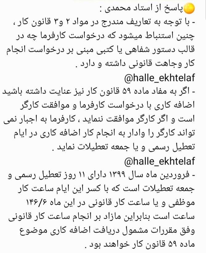 موضوع از این قرار است که چندی پیش از طرف نماینده کارفرما به ما اعلام شده که جهت کنترل هزینهها در فروردین ماه، فقط ۶ روز تعطیل در محل کار حاضر شوید. این در صورتی است که هیچ دستور العمل کتبی در این خصوص کتبی وجود ندارد. شایان ذکر است این دستورالعمل هیچ ربطی به ویروس کرونا و دورکاری ندارد و طی اعلام خودشان بحث کنترل هزینه است. لازم به ذکر است که در سنوات گذشته این چنین نبوده و ما میتوانستیم کل تعطیلات را شاغل به کار باشیم و از مزایای آن برخوردار شویم.