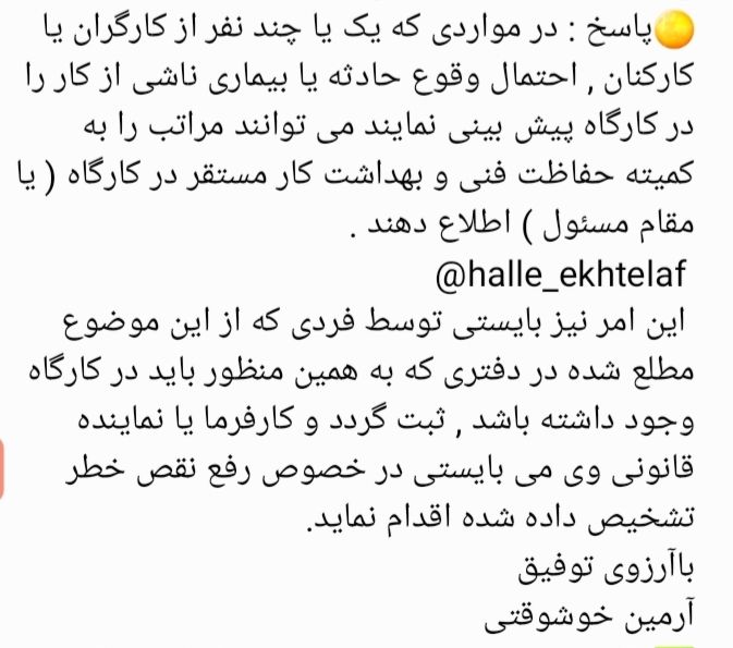 قانون کار و تامین اجتماعی پیش بینی حادثه ناشی از کار نوامبر 21, 2023 ارسال توسط آرمین خوشوقتی 20 مارس سوال: اگر کارکنان در زمان کار خطری را تشخیص بدهند و این احتمال وجود داشته که حادثه ای رخ بدهد چه بایستی کرد؟ به این پست امتیاز دهید