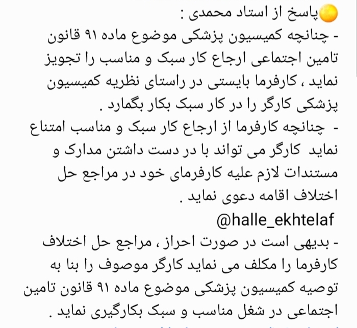 ولی کارفرما با من در جهت انتقالی وارجاع به کار سبک همکاری نمی کنه..
