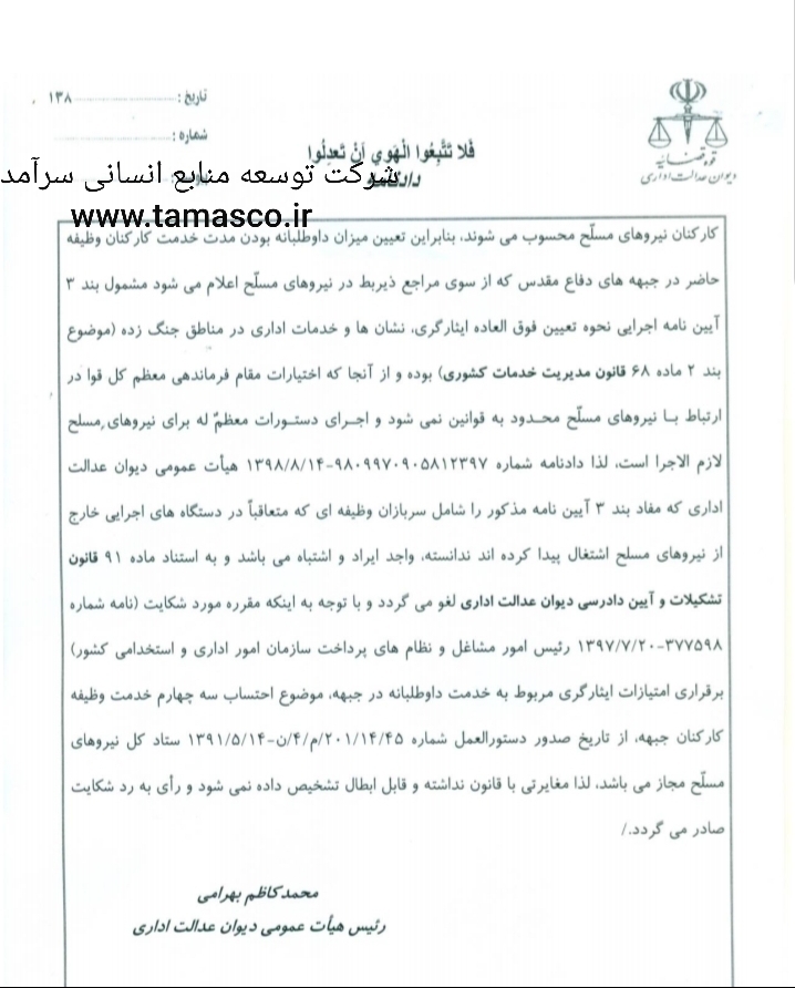 – اخیرا بر اساس رای هیات عمومی دیوان عدالت اداری به شماره ۲۳۹۷ مورخ ۹۸/۸/۱۴ که به جدیدا اصدار یافته است احتساب سه چهارم مدت خدمت وظیفه به عنوان خدمت داوطلبانه صرفاً در سطح نیروهای مسلح قابلیت اجرا داشت و قابل تسری به سایر دستگاه‌های اجرایی نمی دانست .