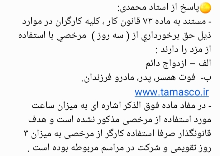 سوال: مرخصی فوت بستگان درجه یک و ازدواج چند ساعته؟ ۳ روز ۷:۲۰ ساعتی؟ یا براساس مدت شیفت ما مثلا ۸:۵۰ یا اگر پرسنل حراست باشن که ۱۲ساعت کار و ۲۴ ساعت استراحتن، ۳تا ۱۲ ساعت؟