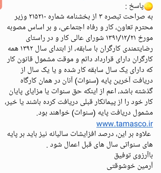 ” ۳- براساس بخشنامه ابلاغی وزارت کار، مبلغ پایه سنواتی مشمول افرادی خواهد شد که در سال گذشته نیز طرف قرارداد کارگاه فعلی خود بودهاند. لذا مبلغ پایه سنواتی با توجه به تغییر کارگاه کارکنان حذف میشود. همانگونه که در سنوات قبل نیز این امر برای افراد مشابه رعایت گردید.”