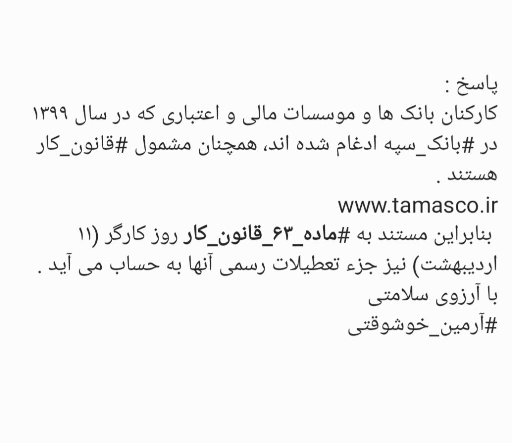 پاسخ : کارکنان بانکها و موسسات مالی و اعتباری که در سال ۱۳۹۹ در #بانک_سپه ادغام شده،اند همچنان مشمول #قانون_کار